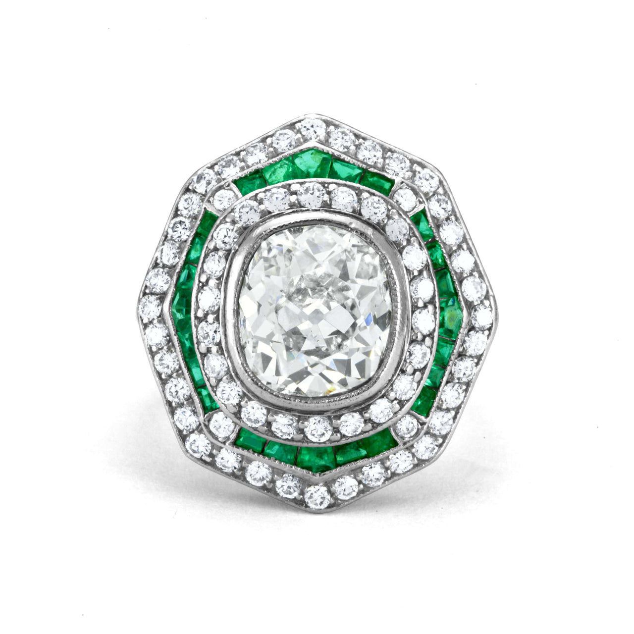 Continuing withthe Art Deco theme, comes this captivating 3.30-carat old mine cut diamond ring with old European cut diamonds and emeralds, set in platinum. At this time, Art Deco began to shift away from an all-white, diamond and platinum look and became influenced by the vibrant coloured gemstones of Asia and the Middle East, following its popularity at Cartier and other legendary houses. This is an impeccable example of a ring from this time period in which Cartier was an innovative force.