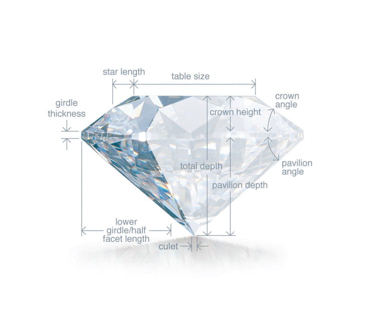 The shallow diamonds have shallow crowns and or shallow pavilions (lower half). These stones will exhibit what we call “shadows” or “dark spots”. These poorly cut diamonds will also lack lustre and look dull compared to well-cut diamonds. Deep cut diamonds face the similar issues to the shallow cut diamonds in that they will not reflect all the light as well as appearing smaller than a well-cut diamond making them less desirable. There is a common misconception that a diamond which looks larger than its actual carat weight is more desirable. That is incorrect. A diamond which looks larger than its actual size will be shallow and poorly cut resulting in obvious shadows as well as appearing dull. We advise against acquiring such stones.