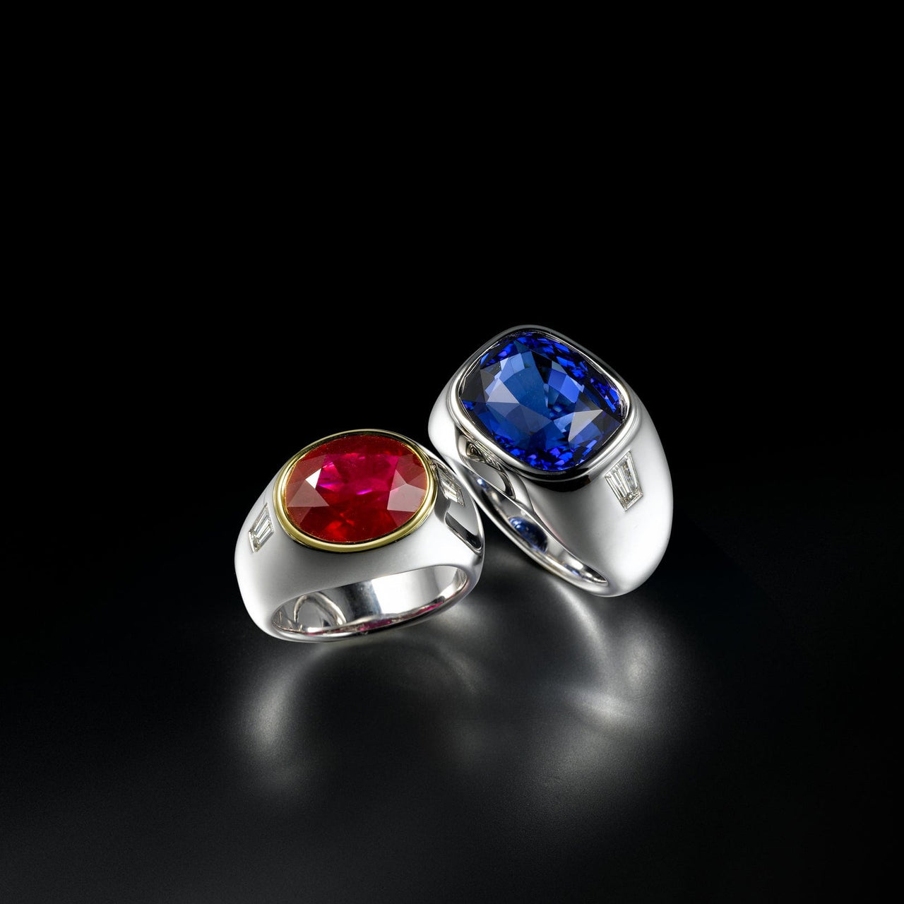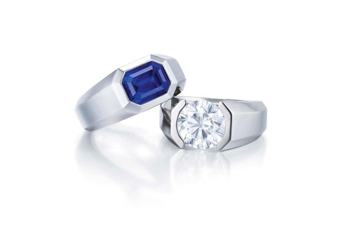 White diamonds, blue sapphires, rubies and yellow diamonds all make excellent centre stones. Emeralds, however, are best avoided, says JJ, because of their fragility, combined with the fact that men tend to be less careful with their jewels.