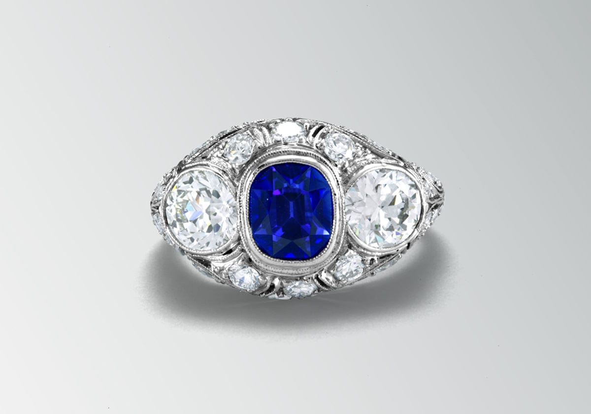 It was the richly saturated 2.14 carat Ceylon sapphire that first drew JJ to this piece. Created around 1920, its vivid colour is completely natural and unenhanced by heat treatment. With all the characteristics we look for in a Ronald Abram sapphire, its distinctive cushion shape makes the perfect centrepiece in this Art Deco cocktail ring, framed by two Old European Cut diamonds.