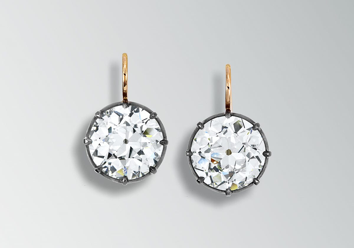 Old European Cut diamonds don’t get any finer than this magnificent pair. Weighing 13.28 carats in total, they were discovered in separate estate pieces that were too worn to warrant restoration. Very well matched in terms of size, colour and clarity, JJ saw the potential to create something simple yet outstanding that in no way compromised their unique character. After repolishing them to restore their lustre, the diamonds were reset in antique-inspired Georgian cut-down settings.