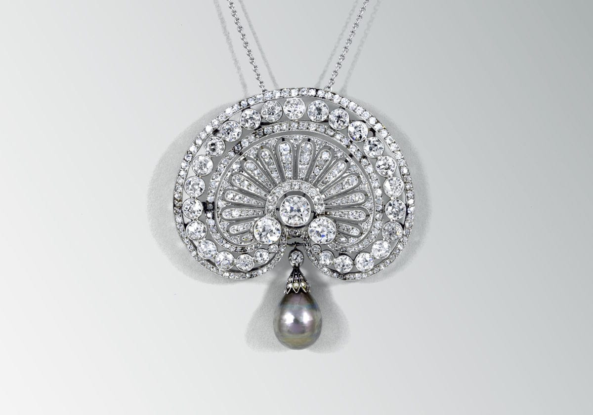 We recently devoted an article to our Victorian jewellery acquisitions, so segueing into another jewel from this period seemed like the perfect way to close this piece. This necklace was crafted in France, where the years spanning 1871-1914 are referred to as the Belle Époque era. The“beautiful age” in France was a time of abundant creativity, characterised by curvilinear forms and depictions of nature. Created towards the end of the era, the diamond-set palmette motif here is an exquisite example of Belle Époque design. Resembling the fan-shaped leaf of a palm tree, a certified natural pearl hangs beneath. Important gems from this period, natural pearls are almost never seen in modern jewellery because of their rarity.