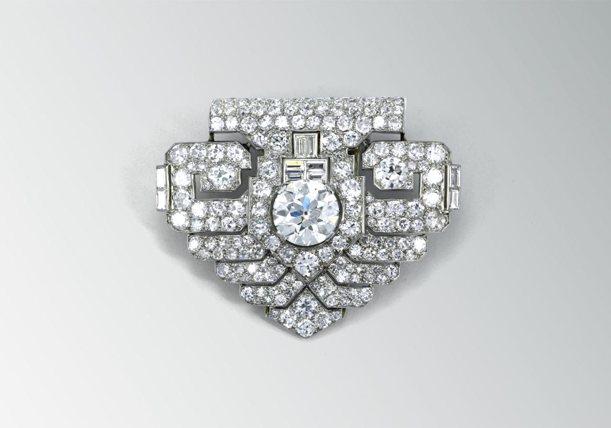 Emblematic of the designs coming out of the Cartier Paris workshop in the 1930s, this is an extremely beautiful example of a clip brooch from the Art Deco era. Set with a 5.25 carat Old European cut diamond, the precursor to the modern round brilliant cut, it is an impressive, generously sized piece that draws inspiration from the Orient. Cartier was heavily influenced by India in the 1920s and 30s, with the brooch’s soft, geometric lines and stepped design echoing the shapes found in traditional Mughal designs.