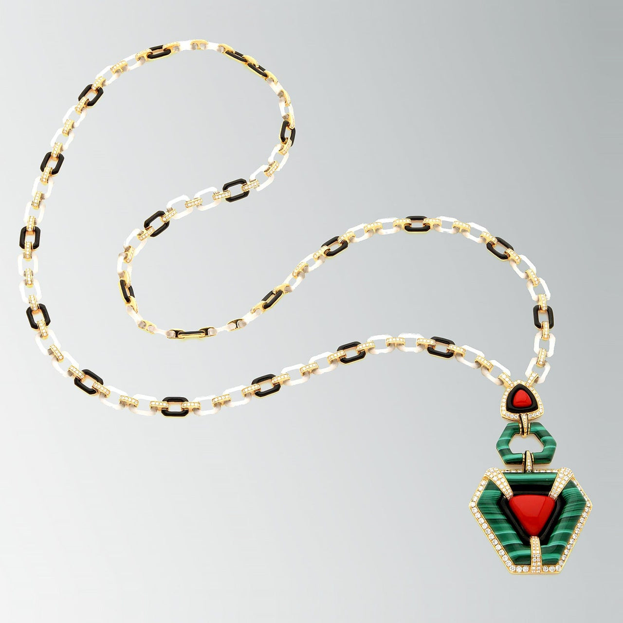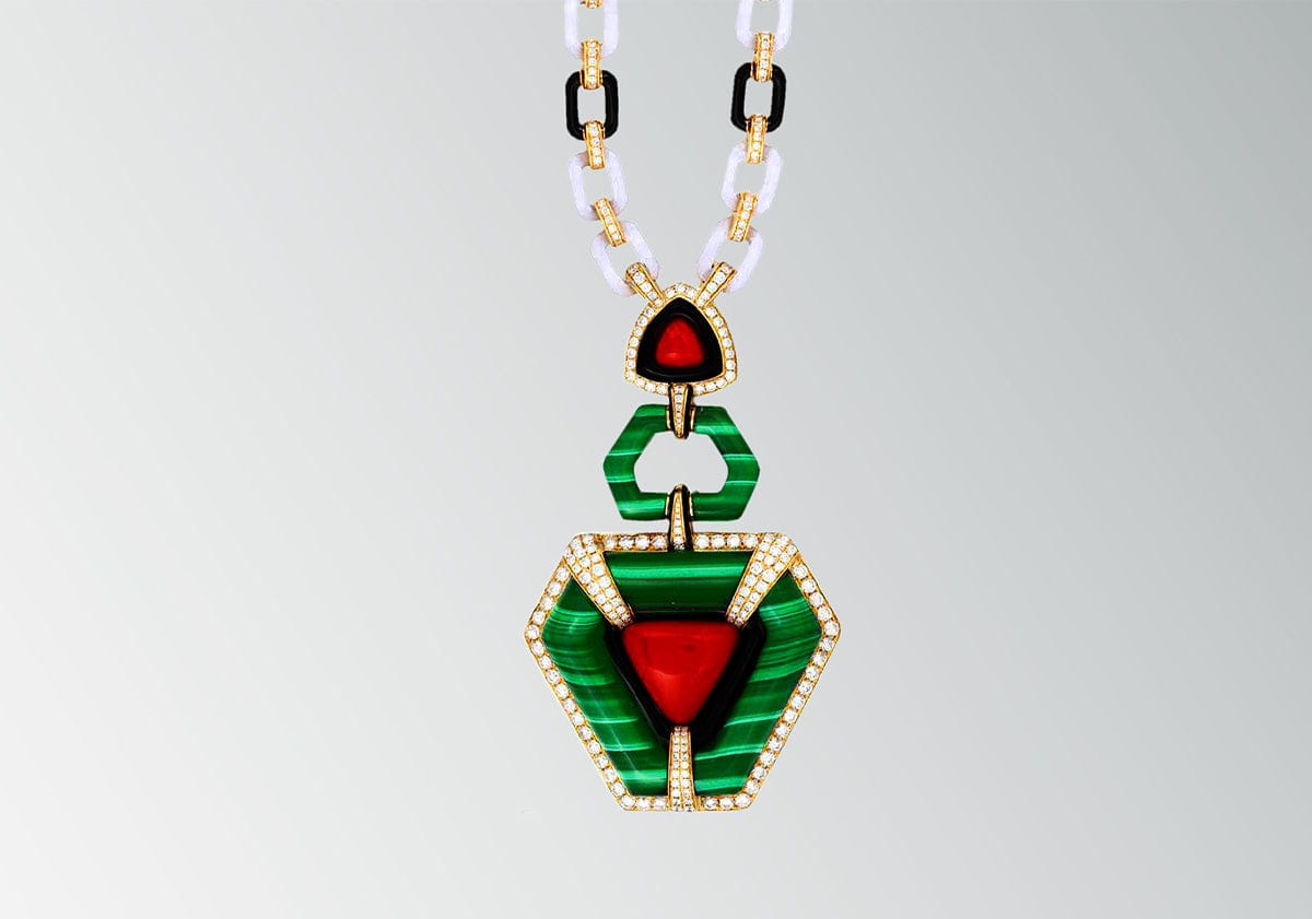 Ever since Ronald Abram began collecting antique pieces more than 50 years ago, he has always had a passion for the golden era of Italian design in the 1960s and 70s. This sautoir has all the artistic hallmarks that we are drawn to at Ronald Abram: complex craftsmanship, an eclectic mix of stones and wonderful wearability. Hand-carving the fine chain links out of rock crystal and onyx would have required great skill, and the creative design is a chromatic delight, with the geometric pendant combining striped green malachite, coral and onyx.