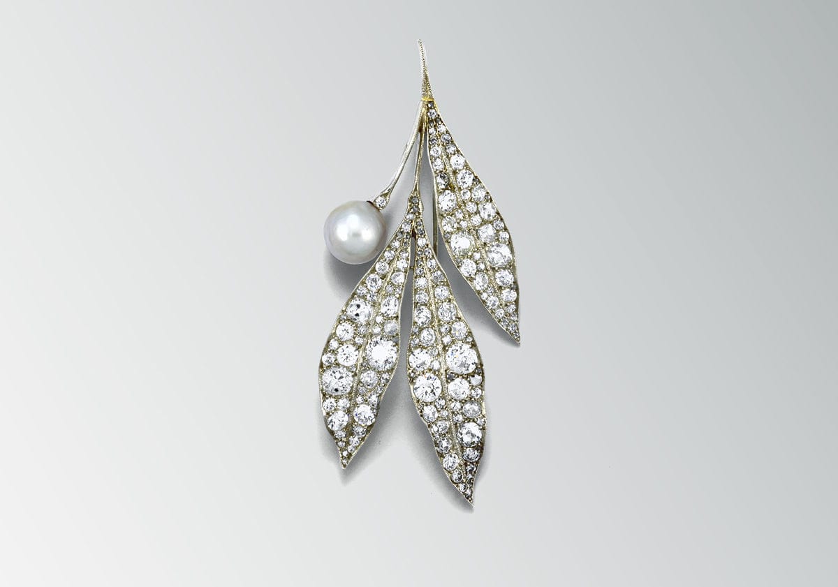 This diamond and pearl brooch, crafted around 1915, is an extremely fine example of French jewellery design from the Belle Époque period, which preceded the Art Deco age. Much of the symbolism of jewels from this era was derived from nature. Here, the contours of the diamond-set leaves are so finely crafted they appear life-like.
