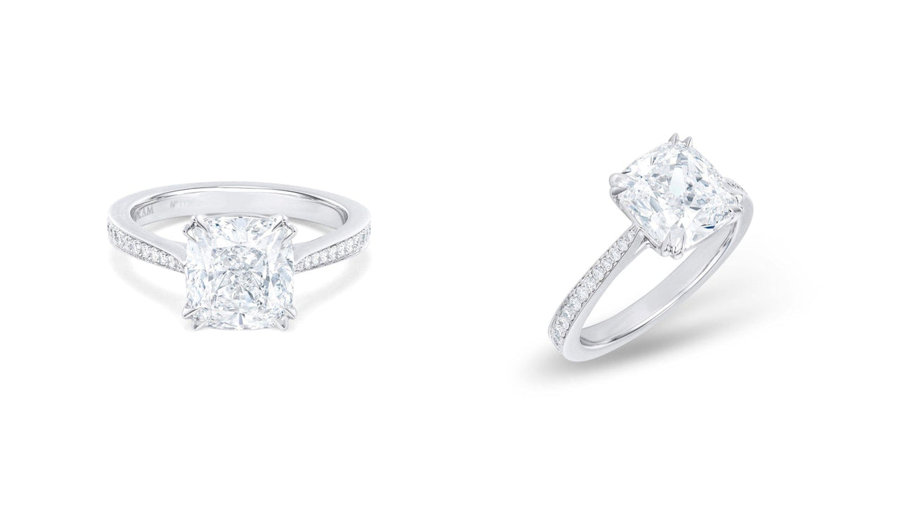 The cushion cut is a beautiful and storied diamond that radiates charm and character. The name evokes an image of a sumptuous pile of luxury pillows with gentle, rounded corners. All cushion cut diamonds share the same curved silhouette feature. Their variation lies in their faceting and proportions, which distinguish an antique cushion cut diamond from a modern cushion cut diamond. While both cuts are desirable, each has a distinct way of interacting with light.