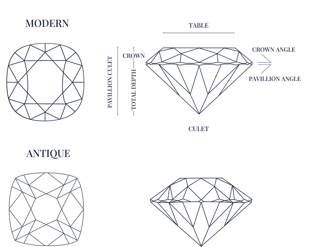 Today, antique cushion cut diamonds are categorised by the GIA(Gemological Institute of America) in two cutting styles: Old Mine Brilliant and Cushion Brilliant. However, the two classifications are generally indistinguishable, and the differences are very subtle. An old mine cut typically has a larger culet, or pointed bottom, a higher crown angle and smaller table than an antique cushion brilliant. Despite what their name suggests, a diamond classified as an old mine cut is not always older than the cushion brilliant. In order to determine whether it can be considered antique, you have to take into consideration the overall cutting style and proportions of the diamond rather than just rely on the GIA certificate.