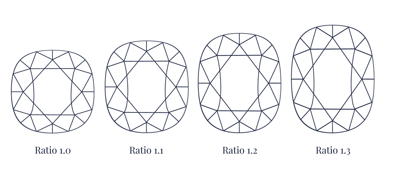 All cushion cut diamonds share an elegant silhouette in either a square or elongated appearance which we calculate in terms of a ratio. To find the ratio, divide the length by the width. For a square stone, where the length and width are equal the ratio would be 1:1. For more elongated stones the ratio will increase, for example a 1:1.15 and greater would be considered elongated. There are beautiful examples of both square and elongated stones. The longer stones tend to cover more of the finger and therefore feel larger, while square stones have symmetry in two directions. It’s really a matter of personal preference and setting style.