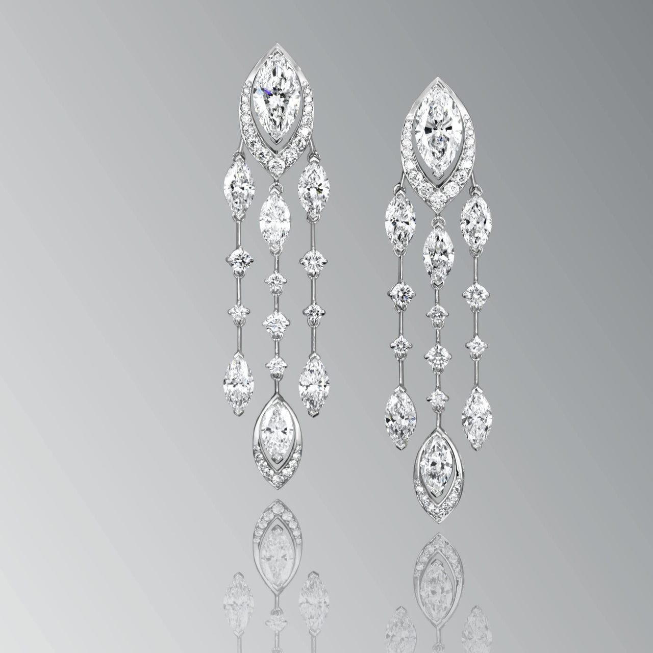 This year, we began with the very popular Mosaic earrings, one of the most distinctive designs in our new collection. Intricate and asymmetrical, the eye is drawn to each stone which appear to be almost floating. From there, other designs were born, designs that take their cue from the traditional cluster and droplet patterns but with a much more contemporary look and feel. Like the Mosaic, spacing is prevalent to showcase the intricacy of these creations and allow each stone to radiate.